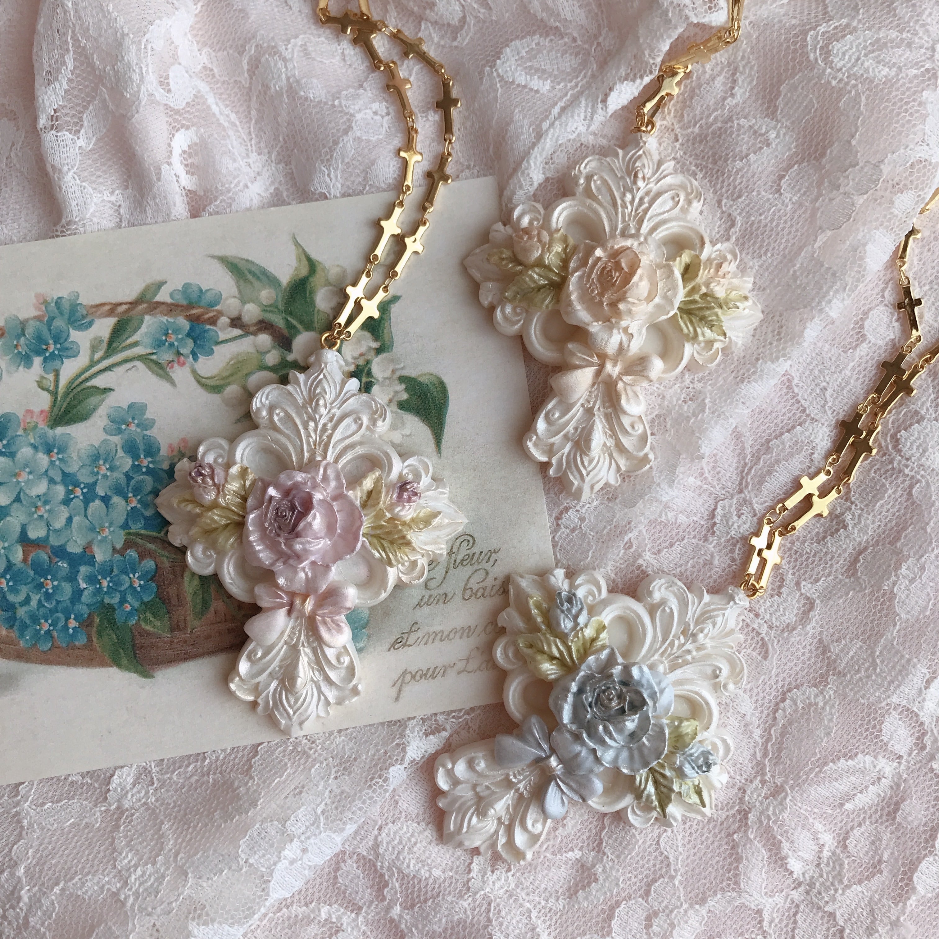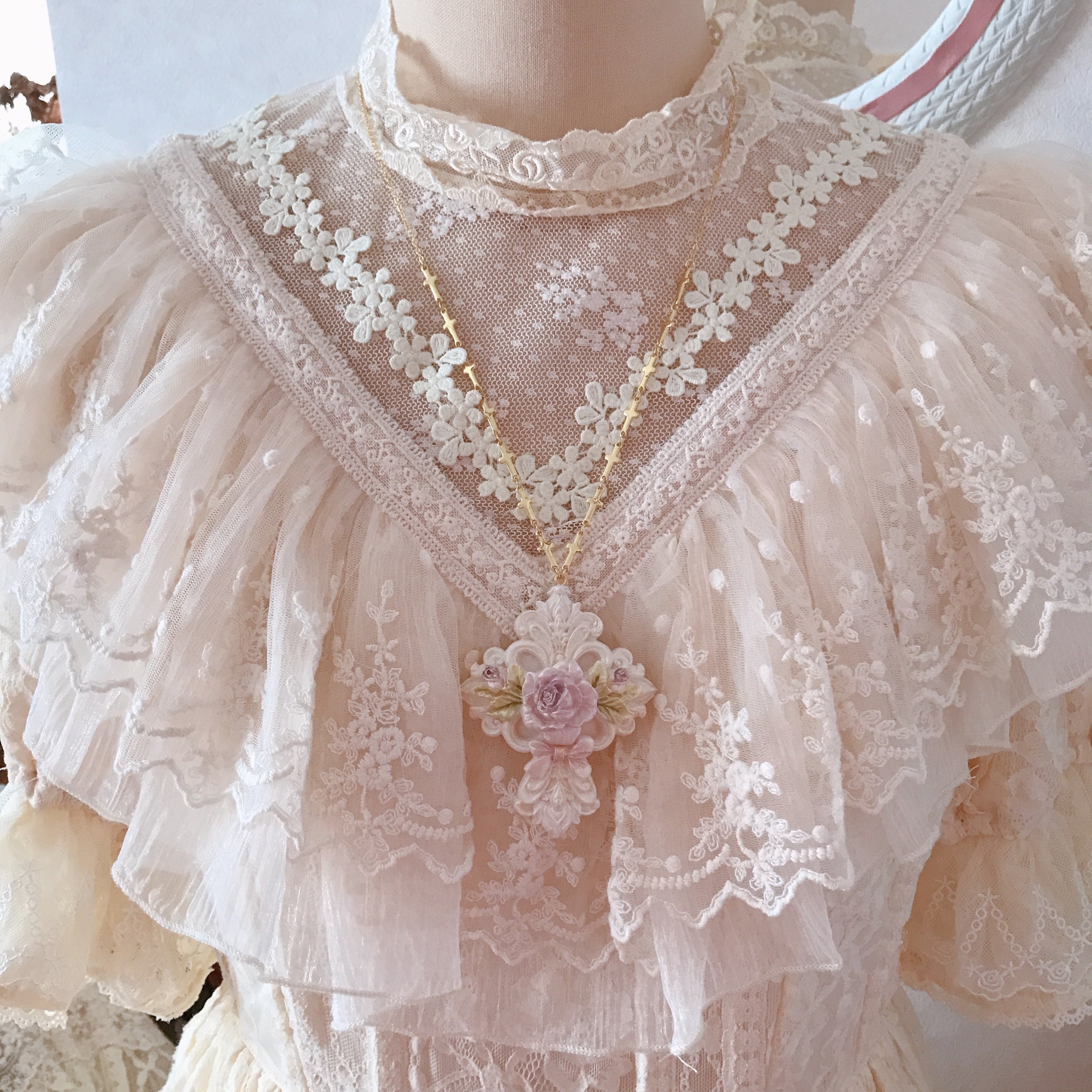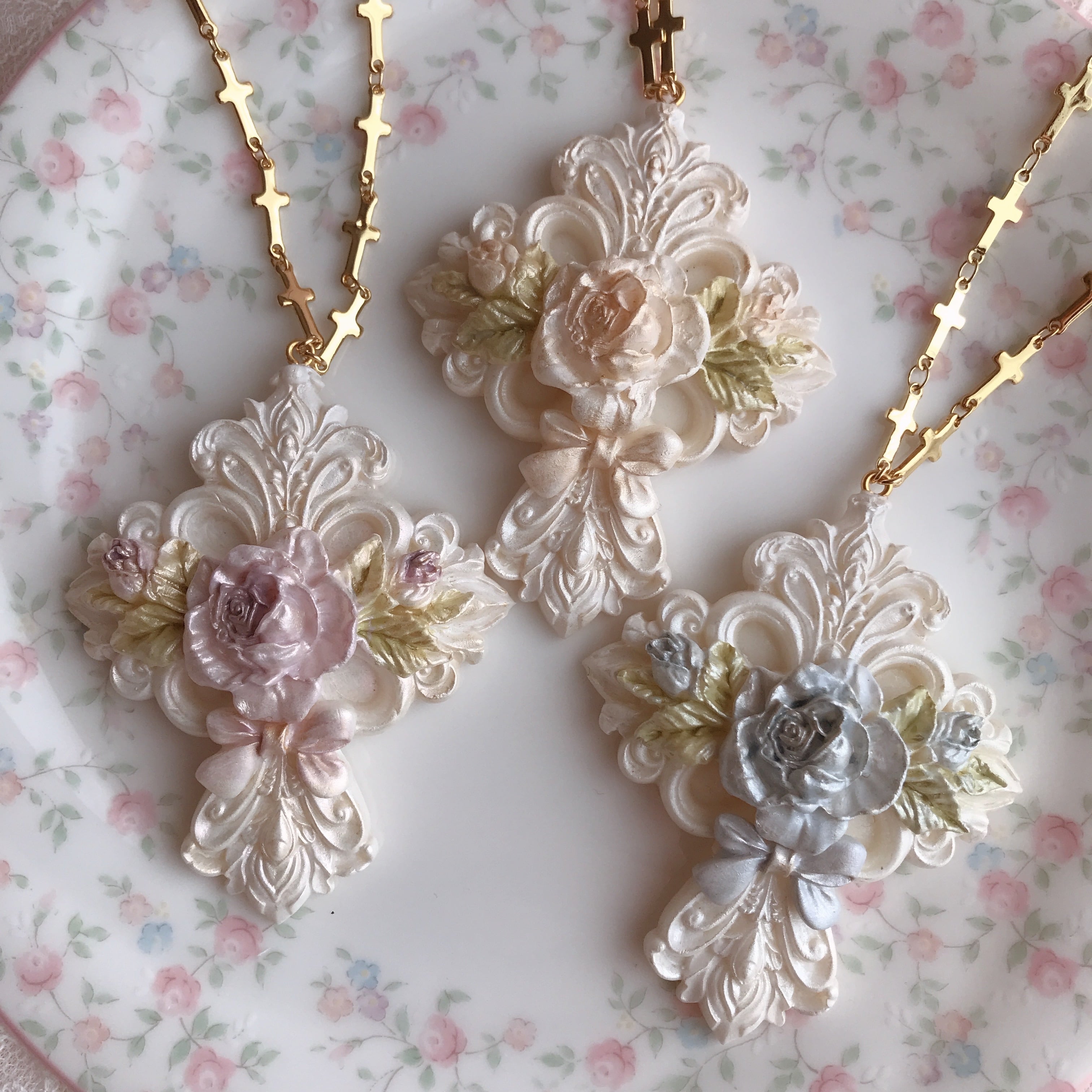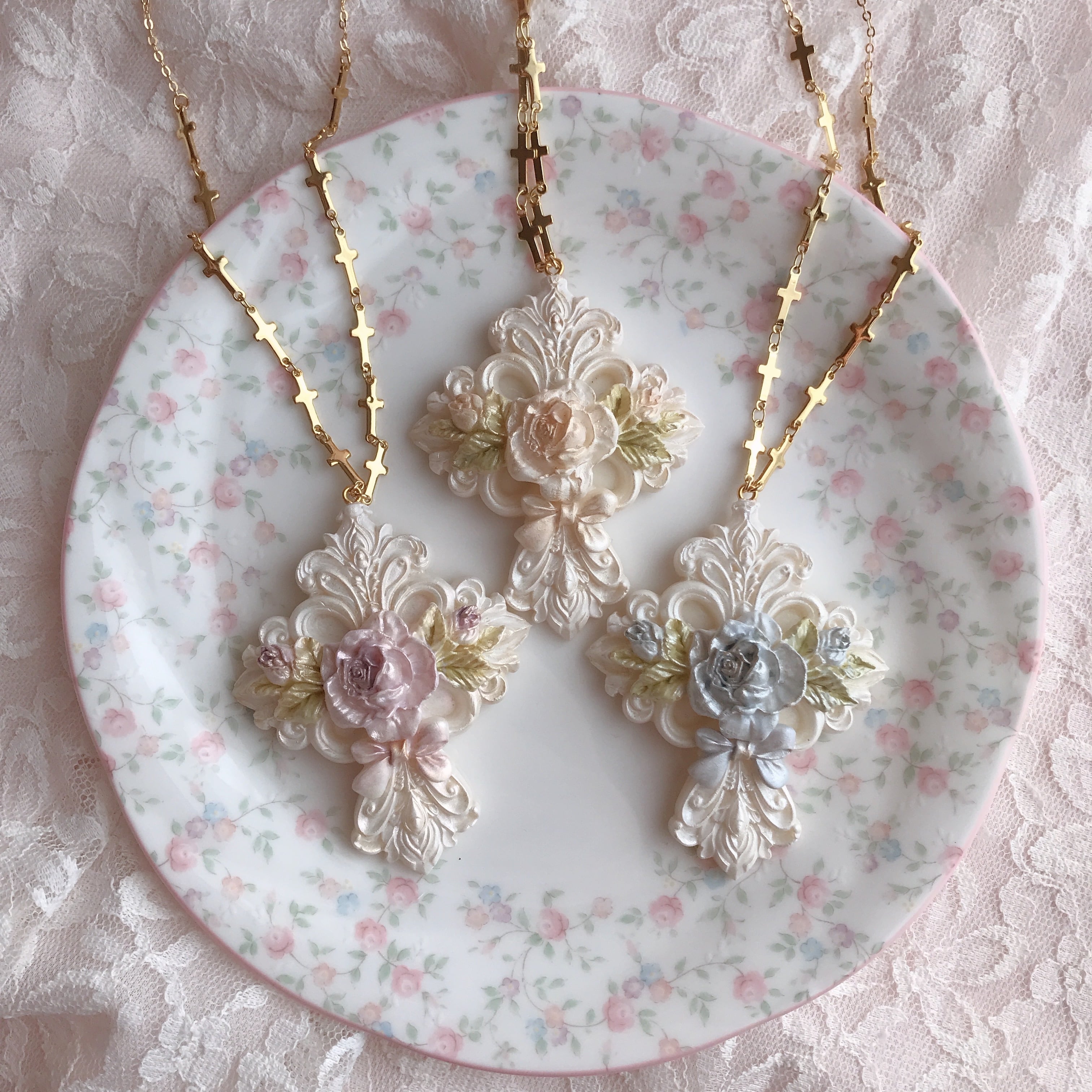 大胆で繊細なモチーフの十字架の中心に咲き誇る薔薇が印象的なネックレス。