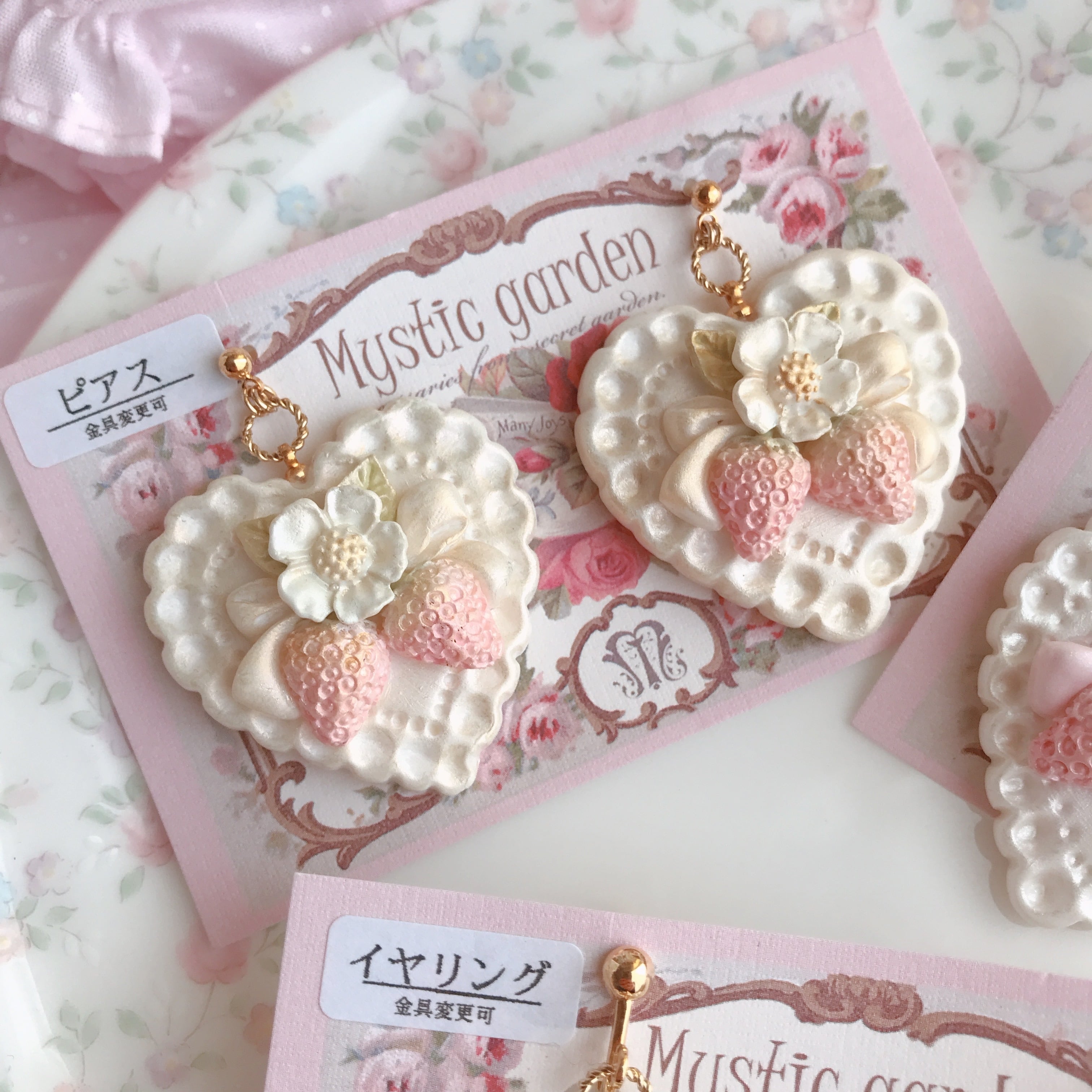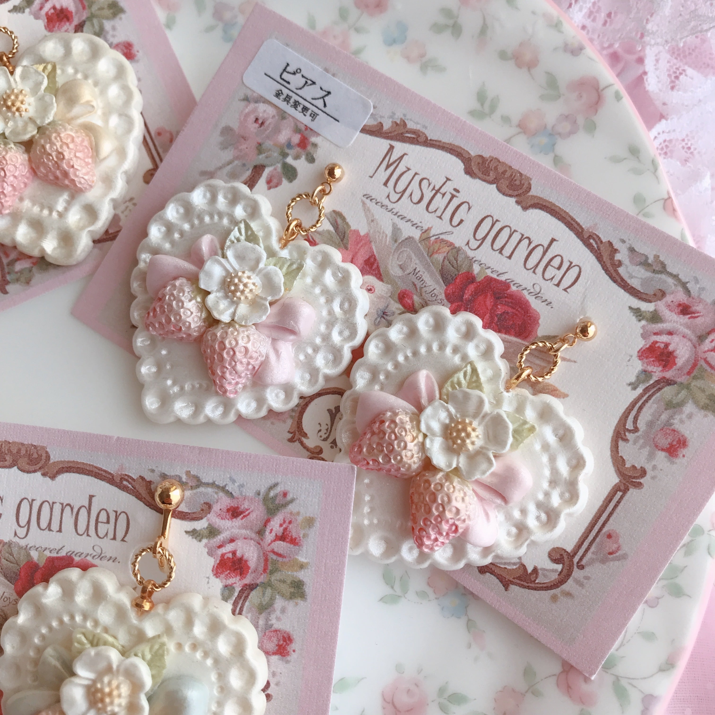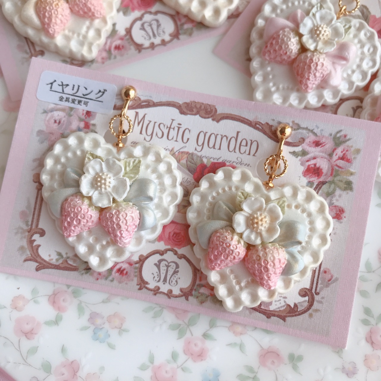 お砂糖のように甘い甘いレースのハートに、甘酸っぱい苺と恋心を乗せたロマンチックな耳飾りです♪