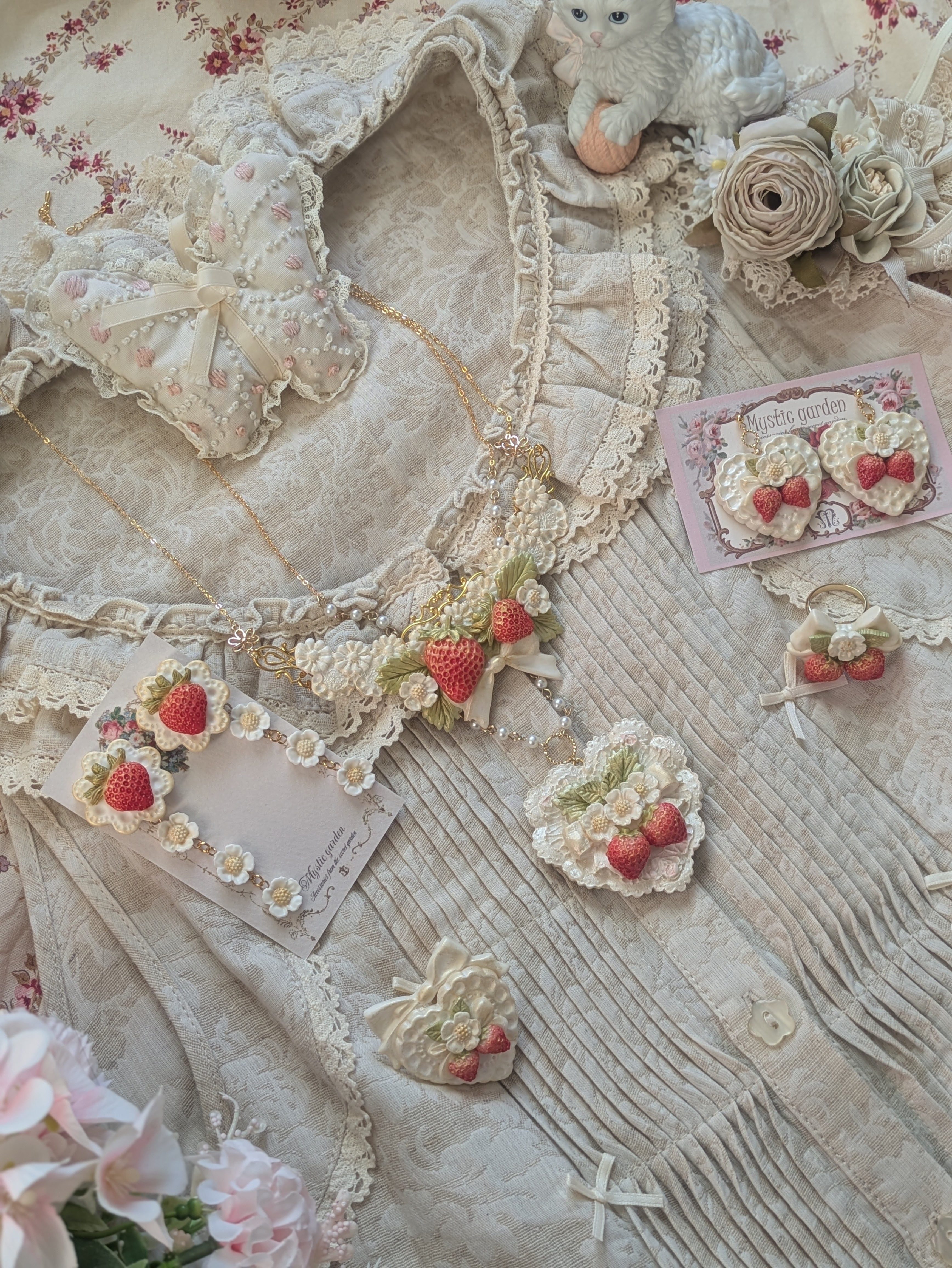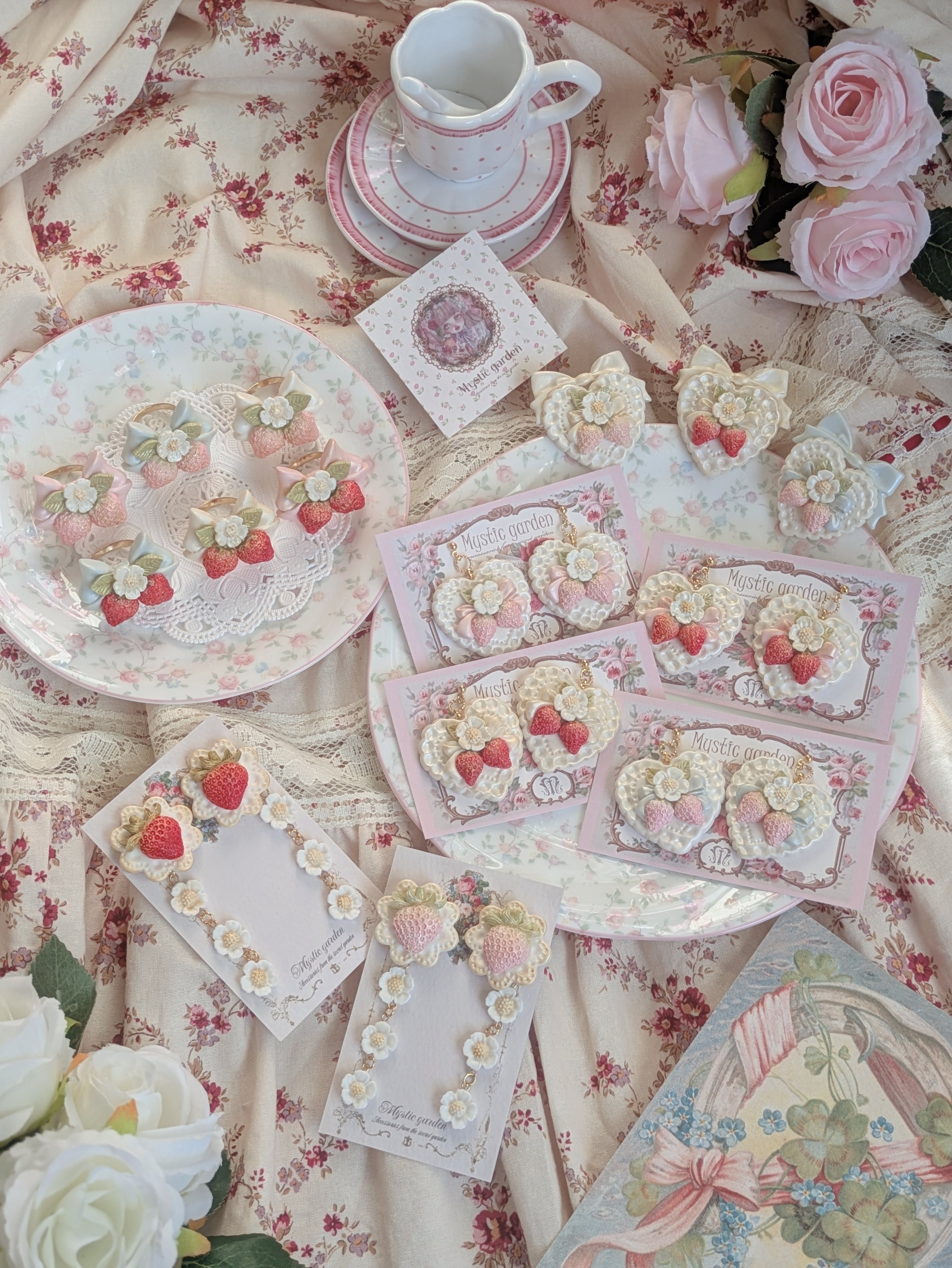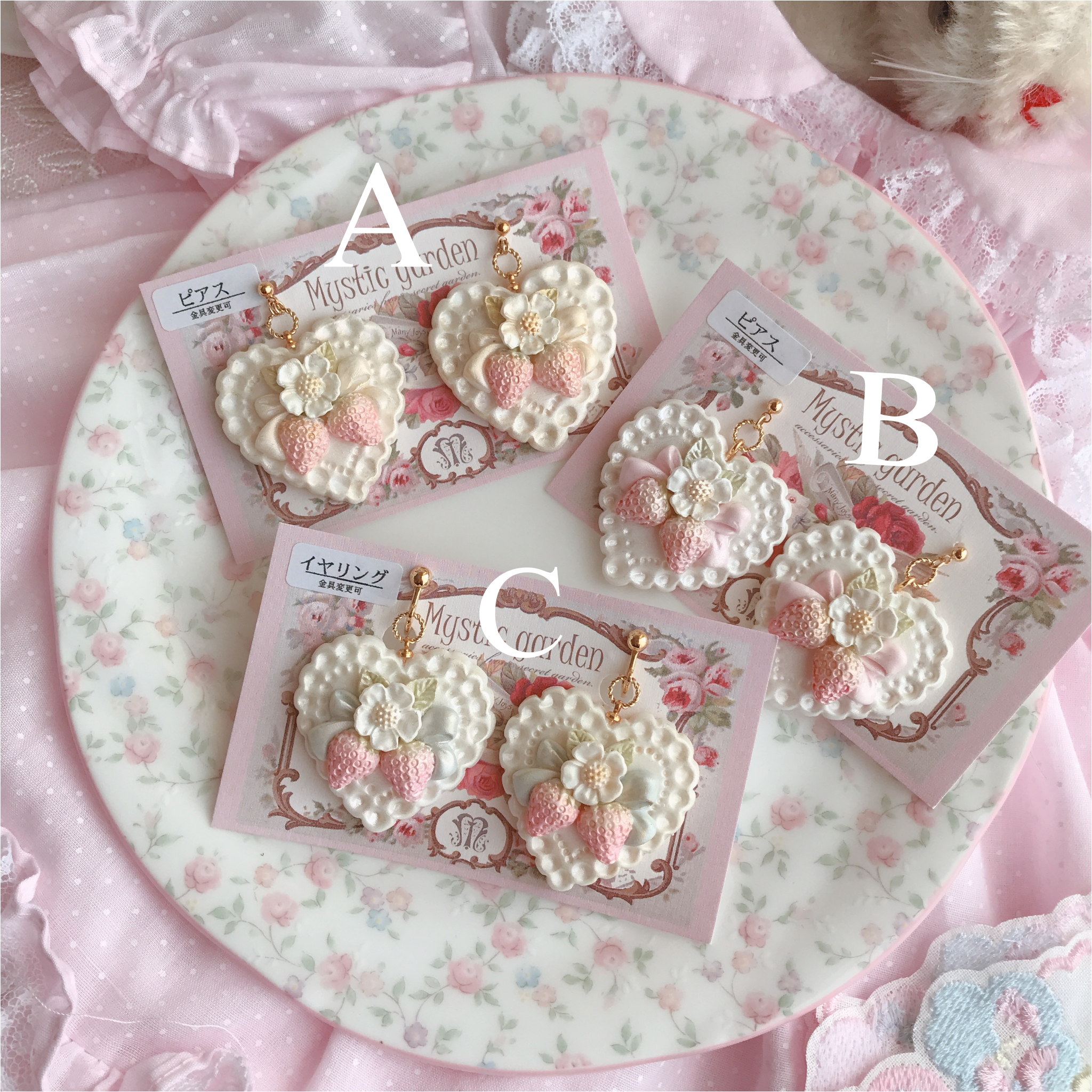 お砂糖のように甘い甘いレースのハートに、甘酸っぱい苺と恋心を乗せたロマンチックな耳飾りです♪