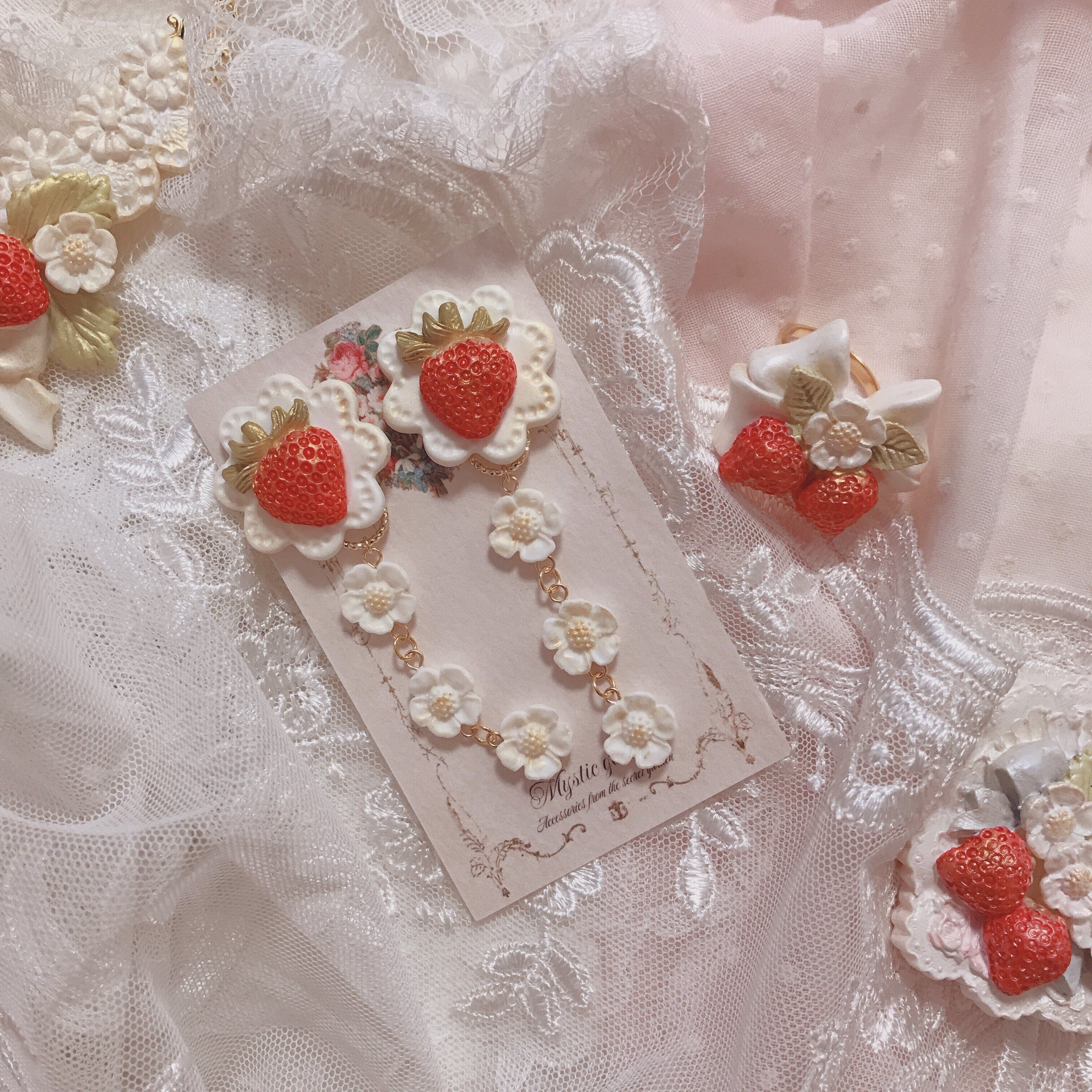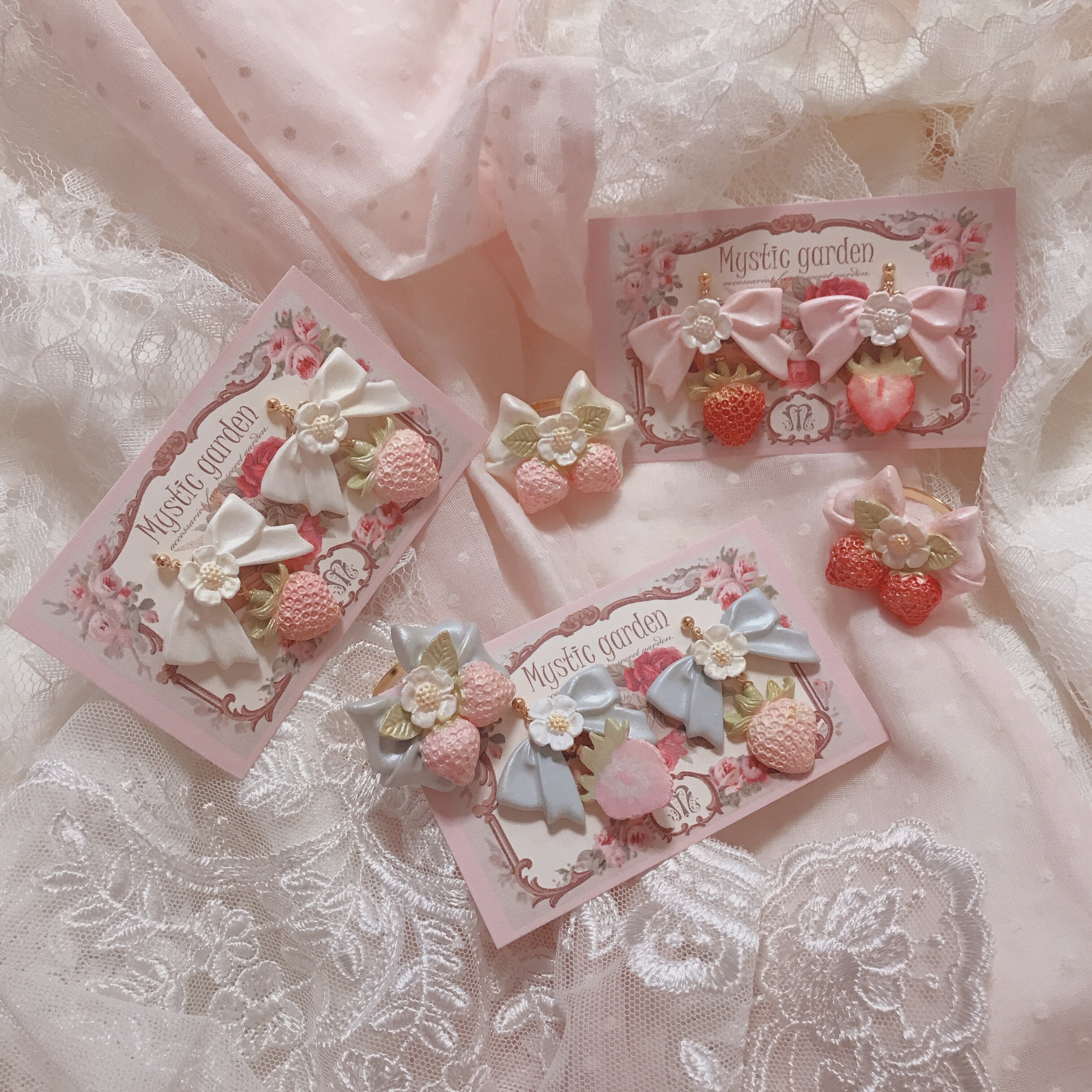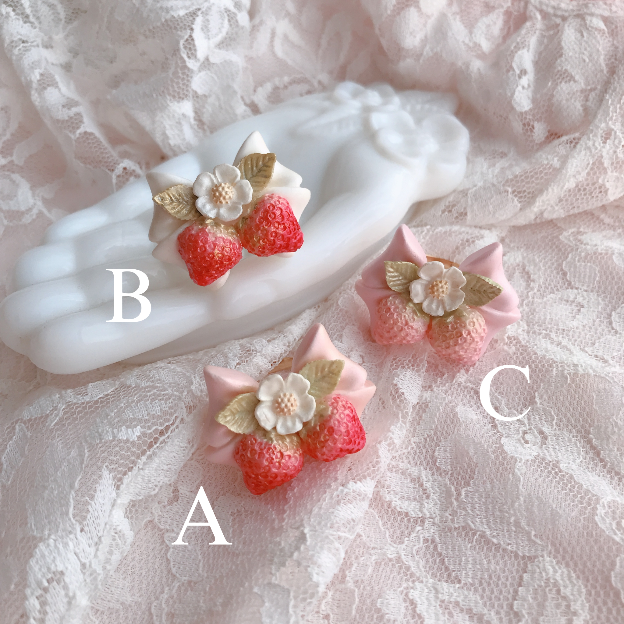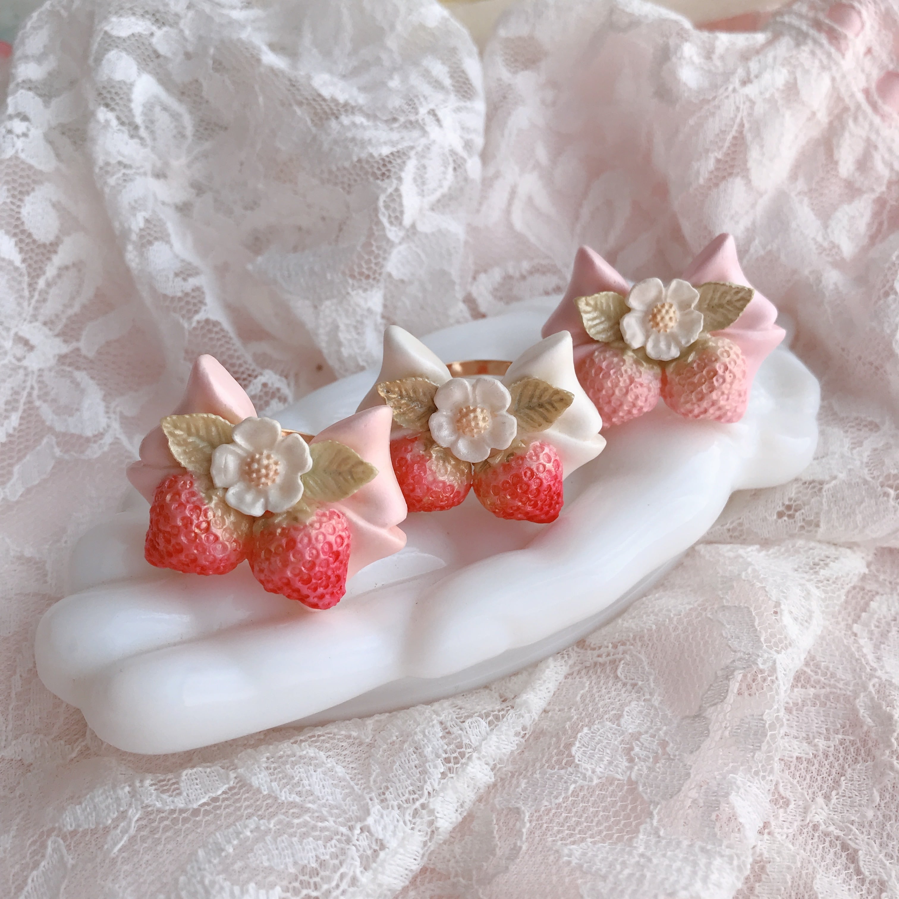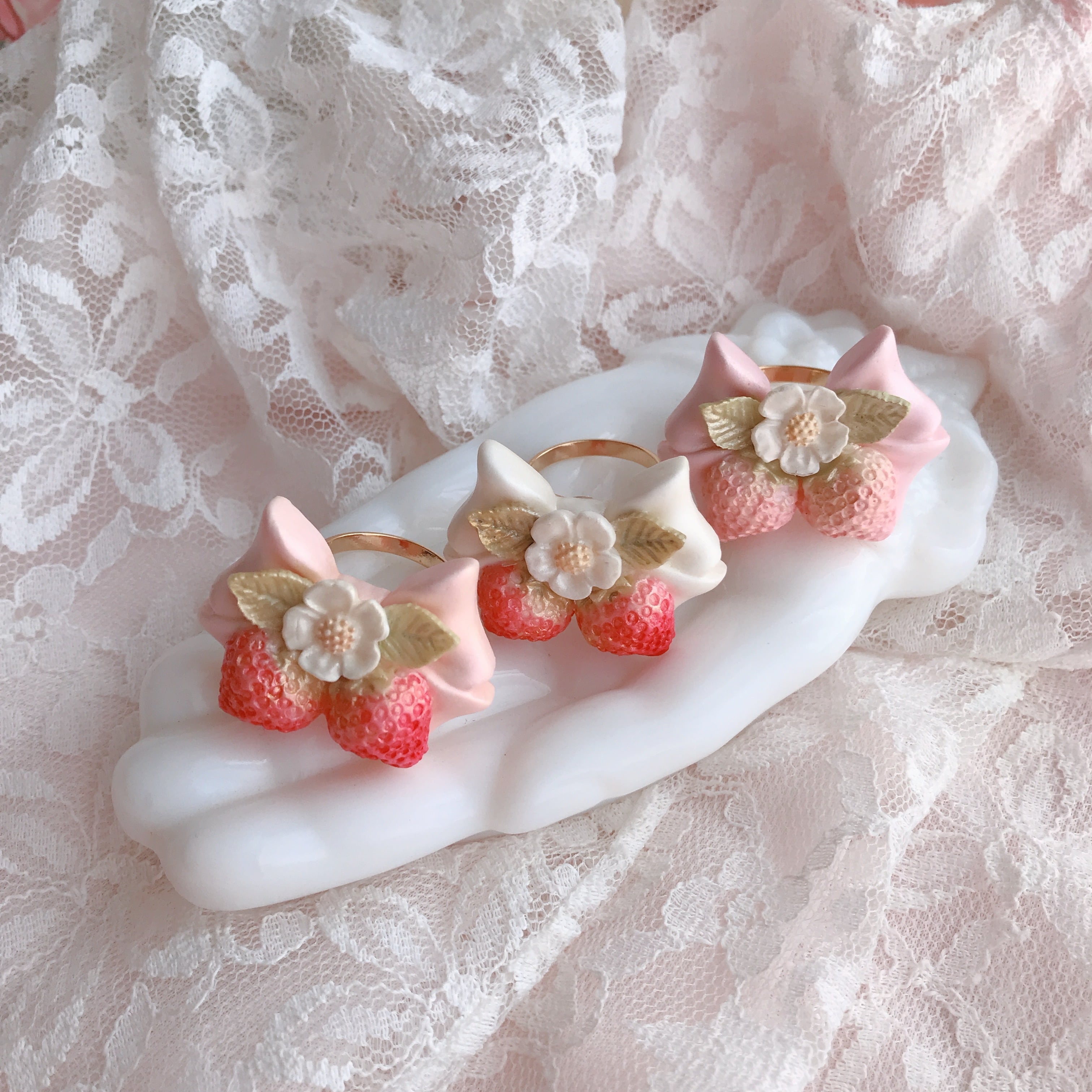 ネックレスとお揃いのデザインのリボンと苺の指輪達。
