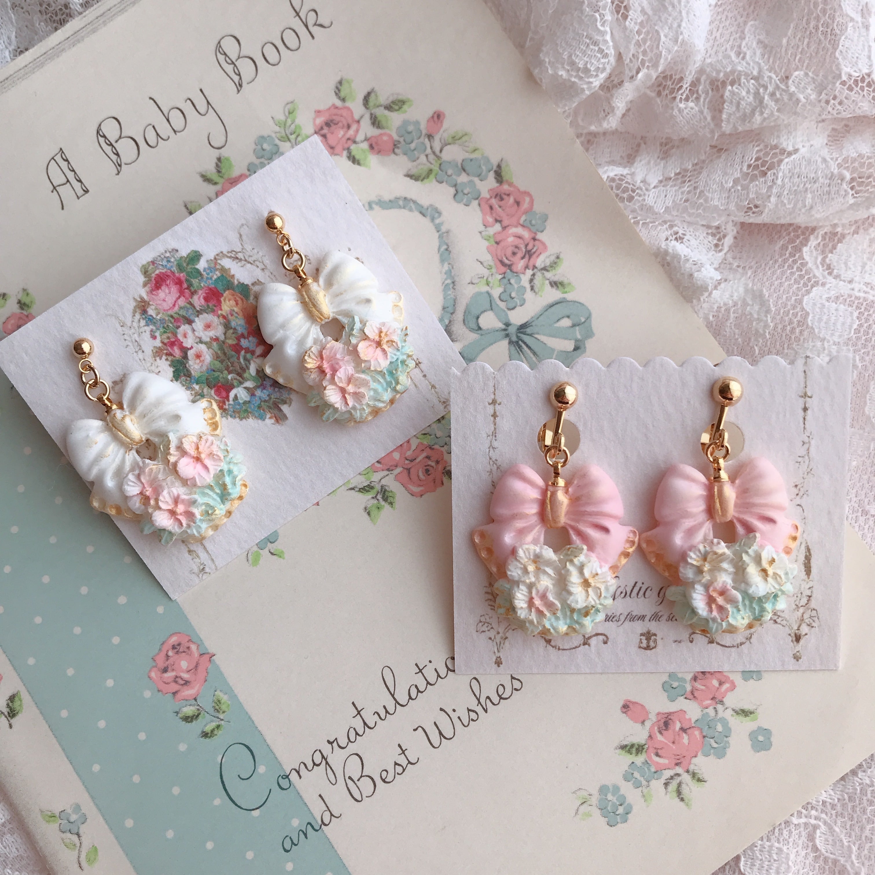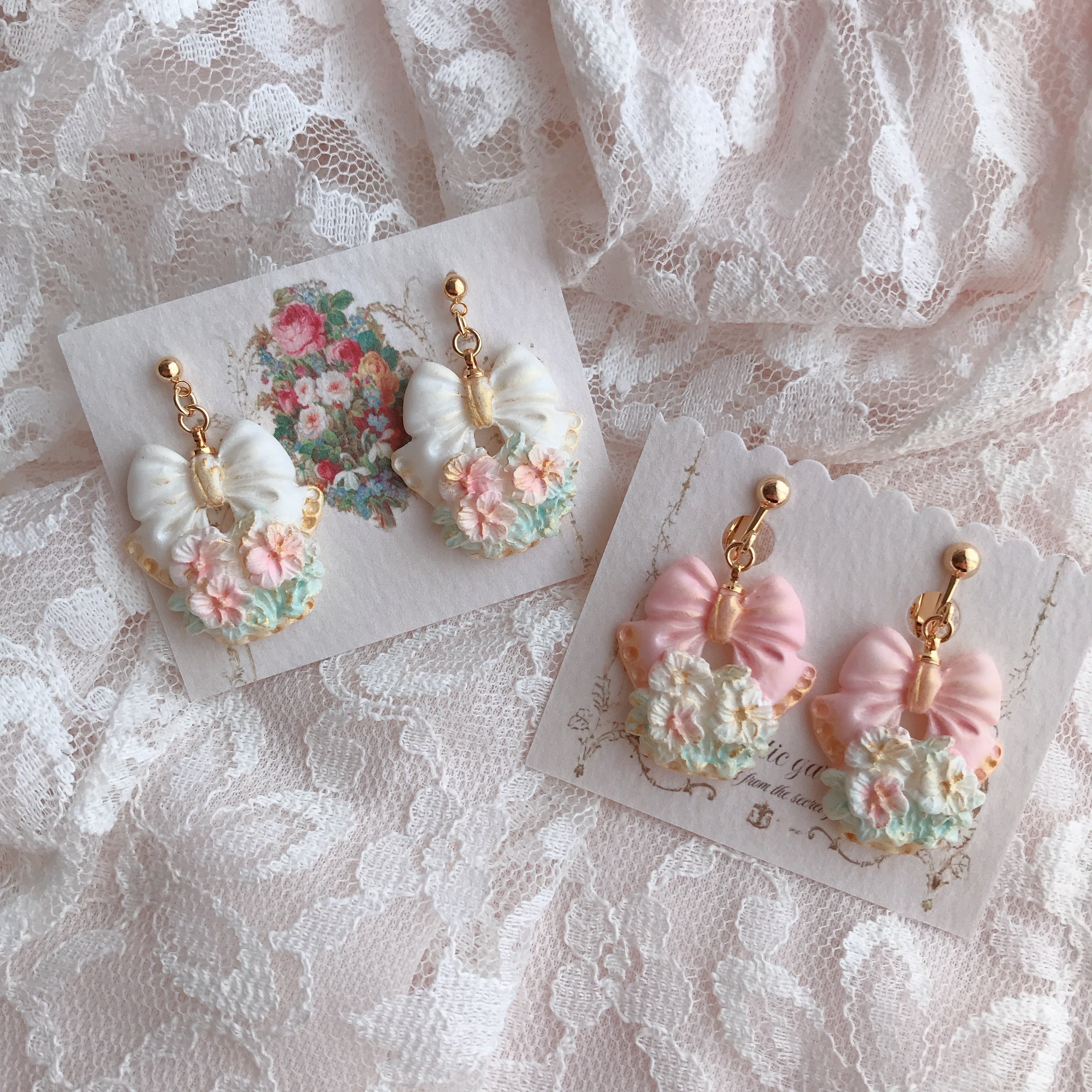 大きなリボンでラッピングされたお花の耳飾り✨️